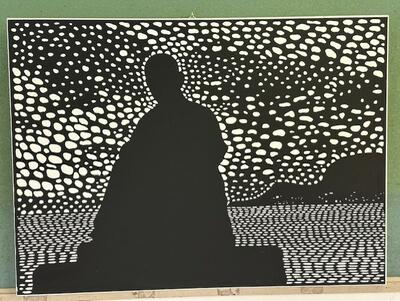 啄木像・函館山・立待岬・海・空がモノトーンで描かれていますが、作品を見る者の想像力にそれらの色彩や陰影がゆだねられる奥深い作品です。