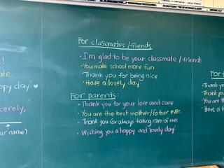 長嶋先生とエリエルさんの英語では感謝の言葉を伝えるカードを作成しています。